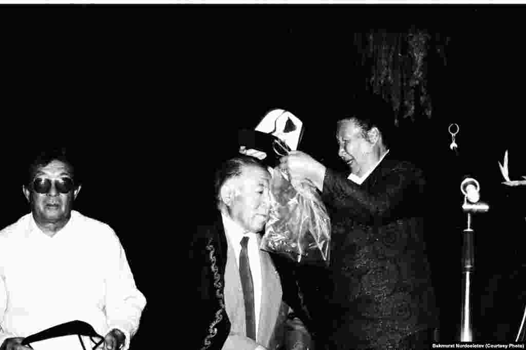 Төкмө акын Майра Керим кызы сахнада 55 жылдан кийин мекенине келген Азамат Алтайдын урматына ырдап жатат.