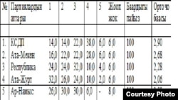 Азыркы парламентке элдин баасы кандай? Кыргыз социологдорунун ассоциациясы жетектеген илимий топтун (К. Исаев, С. Сыргабаев, Б. Малтабаров) иликтөөлөрүнүн жыйынтыгы боюнча азыркы Жогорку Кеңештеги 5 фракциянын 5 жылдагы ишмердүүлүгү 50 эксперттин баамында “беш” баллдык шкала менен эсептегенде “үч” деген баага да жетпей калган. Аны төмөнкү таблицадан көрүнүз: