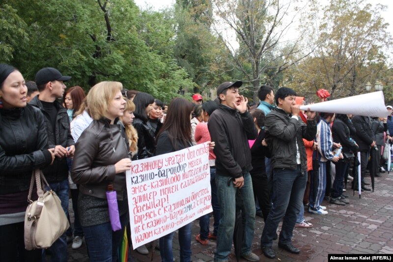Жогорку Кеңеш имаратынын алдында казино, оюн автомат жайларында иштегендердин демилгеси менен уюштурулган митингге чогулгандардын саны үч миңдин айланасында экенин окуя болгон жерден кабарчыбыз маалымдады. Алар кумарканаларды жабуу боюнча мыйзам долбооруна каршы экенин айтышууда. Митингчилер колдоруна "Кумарканалар жабылса мамлекеттин кирешеси азаят", "Парламент жумуш орундарын кыскартканы жатат" деген жазууларды кармап турушат. Алардын айтымында, учурда өлкө боюнча кумаркана жана оюн автоматтарын иштеткен жайларда 15 миңге чукул адам эмгектенет. Ушундай эле митинг Ош шаарында да өтүп, ага 300 чакты адам катышып жатканын аймактагы кабарчыбыз кабарлады.